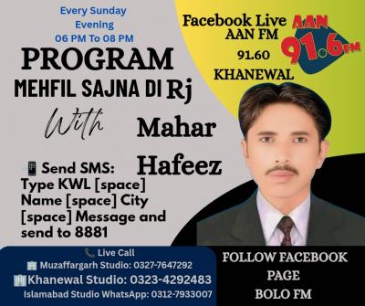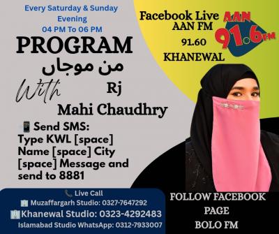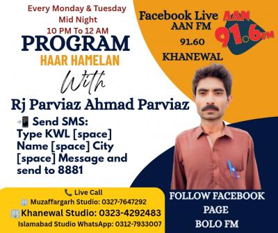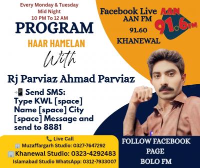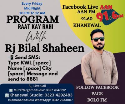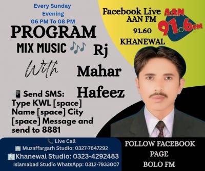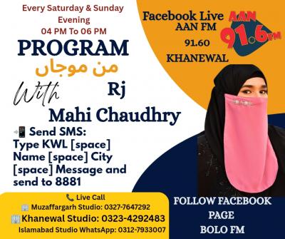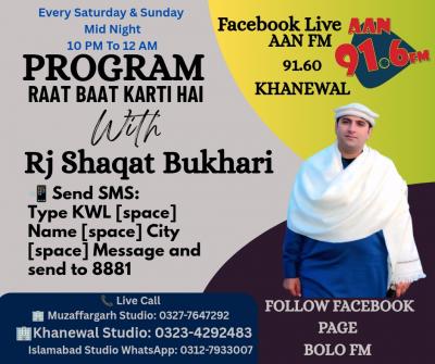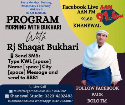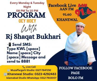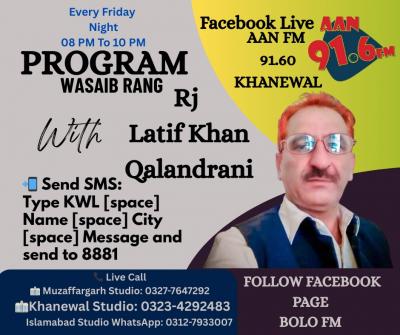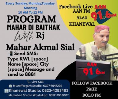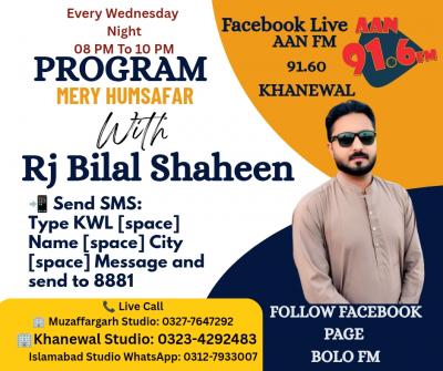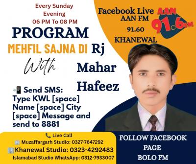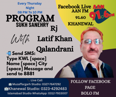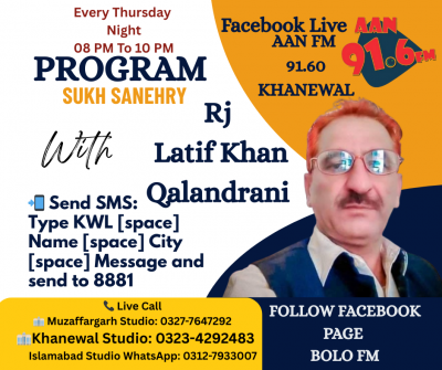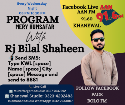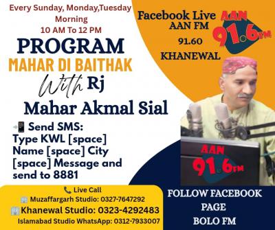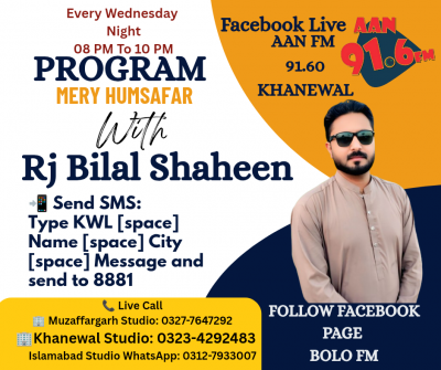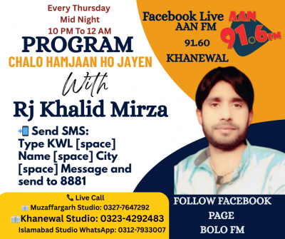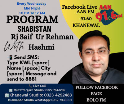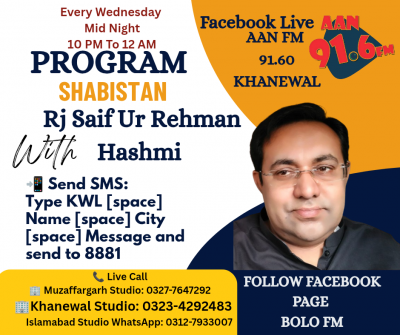 🎙️ Experience the vibrant pulse of Khanewal with AAN FM 91.60 — live 24/7! 📡 🗣️ Languages: Saraiki | Urdu | Punjabi 📡 Station: AAN FM 91.60 – Khanewal 🎶 Dive into soulful music, rich culture, and community voices! 📞 Live Call Numbers: 🏢 Muzaffargarh Studio: 0327-7647292 🏢 Khanewal Studio: 0323-4292483 📲 SMS: Type KWL [space] Name [space] City [space] Message → send to 8881 📍 Studio Location: SB Media Group, HBL Plaza, Ahl-e-Hadees Chowk, Khanewal 📘 Follow Our Facebook Page: BOLO FM